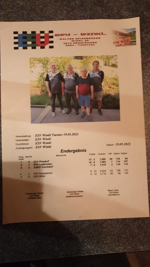 Als Lohn für Platz 3 beim Turnier in Winkl gab es für unser Team mit Reinthaller, Rührlinger, Radinger und Heissl den wohl besten Zirbenschnaps der Region.
