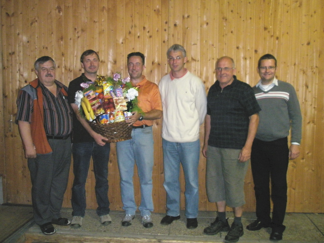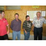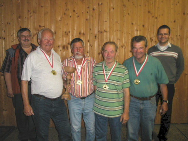Die Siegermannschaft (Kubista Walter, Edtmayr Bertl, Malfent Karl und Kronberger Gottfried mit Bürgermeister Schimpl und Sektionsleiter Raffelsberger