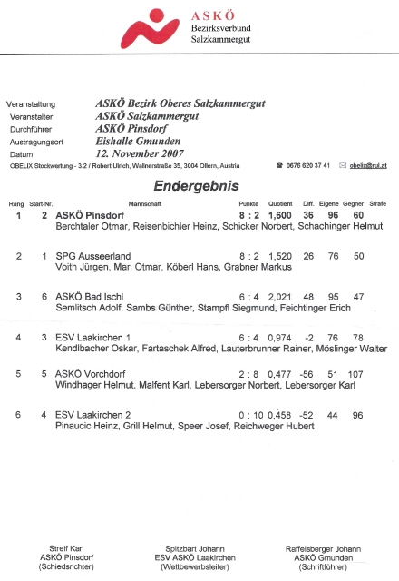 In der ASKÖ Unterliga West gab es nach einem Wechselbad der Gefühle für unser Team mit Rührlinger Christian, Radinger Franz, Ziegelbäck Manfred und Raffelsberger Tobias schließlich den 11. Platz als Endergebnis. Dies wird wohl für den Klassenerhalt nicht reichen, doch wie gesagt, dieses Team hat sich Zukunft.