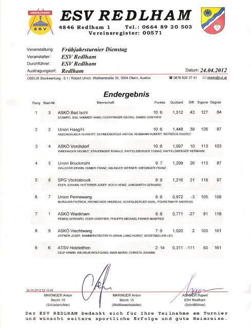 Mit 6 Siegen und 2 Niederlagen wurde punktegleich mit dem Zweiten Fischlham Platz 3 fixiert.