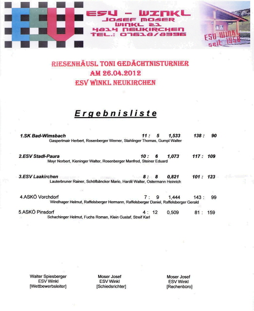 Das Team mit Windhager Helmut, Reinthaller Hans, Schimpl Sepp und Raffelsberger Daniel schlug sich wacker und erreicht mit je 3 Siegen und Niederlagen Rang 4.